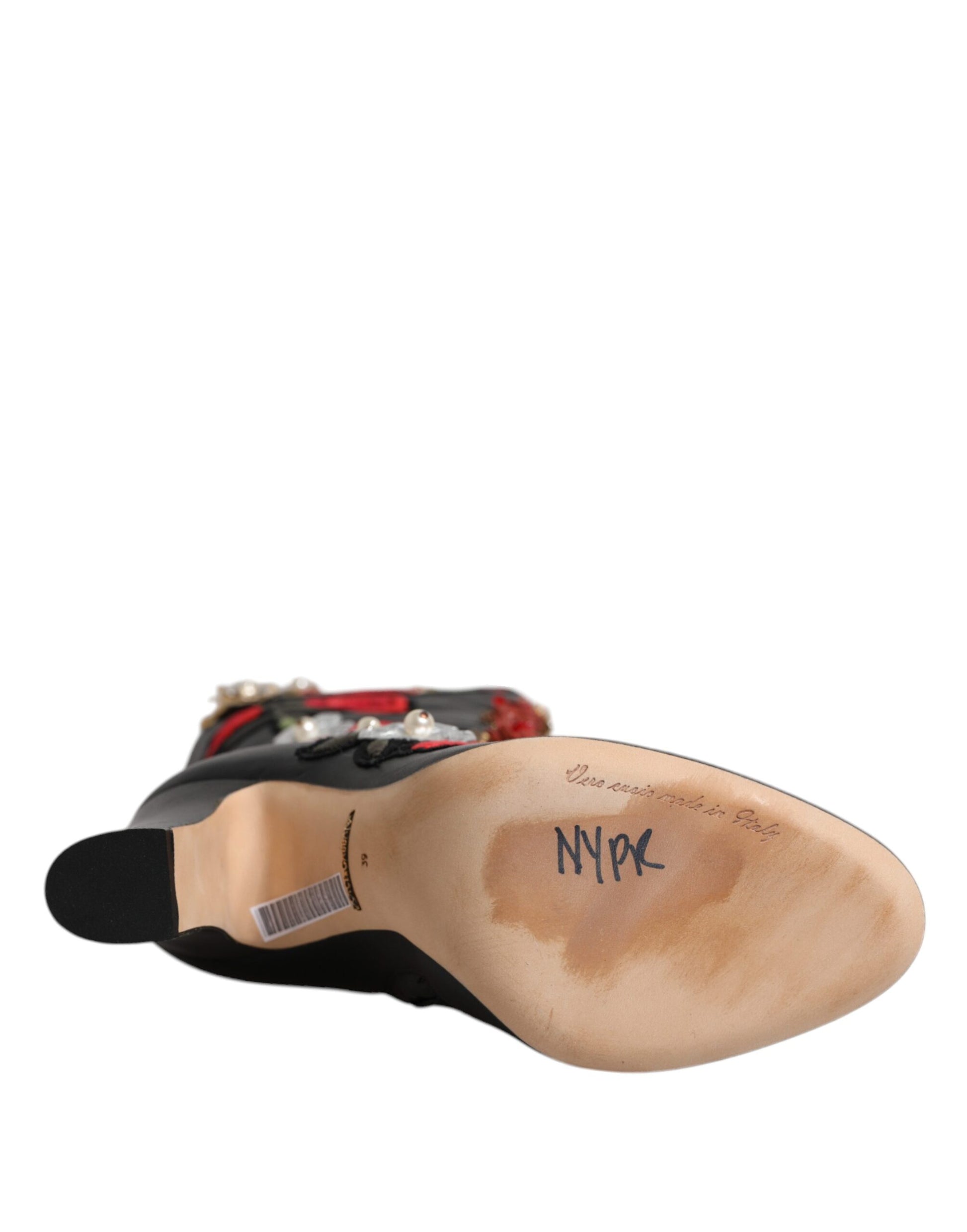 Black Roses Embellished Leather Heel Boots Shoes