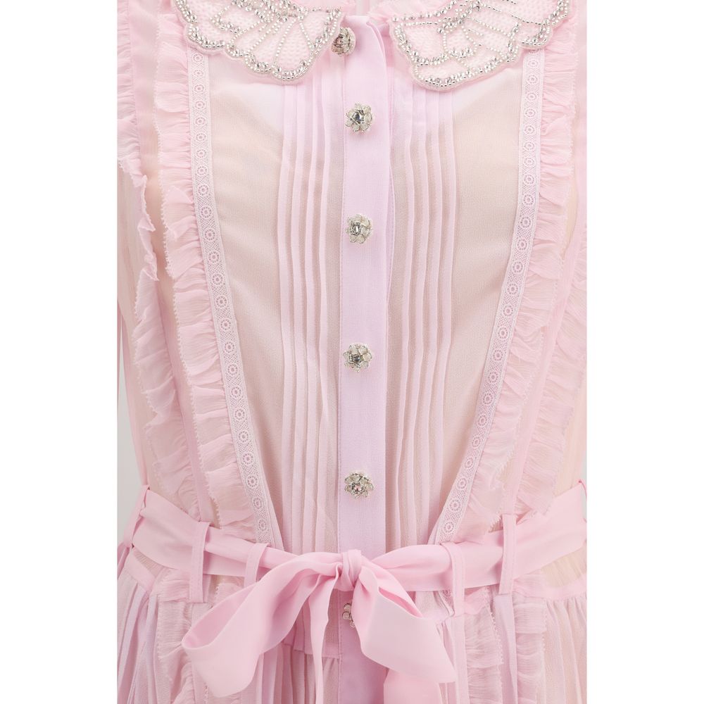 The pleated georgette midi Dress by Self-Portrait expresses lightness and refined femininity through fluid pleats, soft ruffle details, and luminous trims. Designed with a fitted silhouette, it features an embellished collar that frames the neckline with a subtle, jewellery-inspired glow. The button-down front adds a classic note, while the removable cami lining and detachable belt allow for versatile styling. A sophisticated piece conceived for special, intimate occasions.